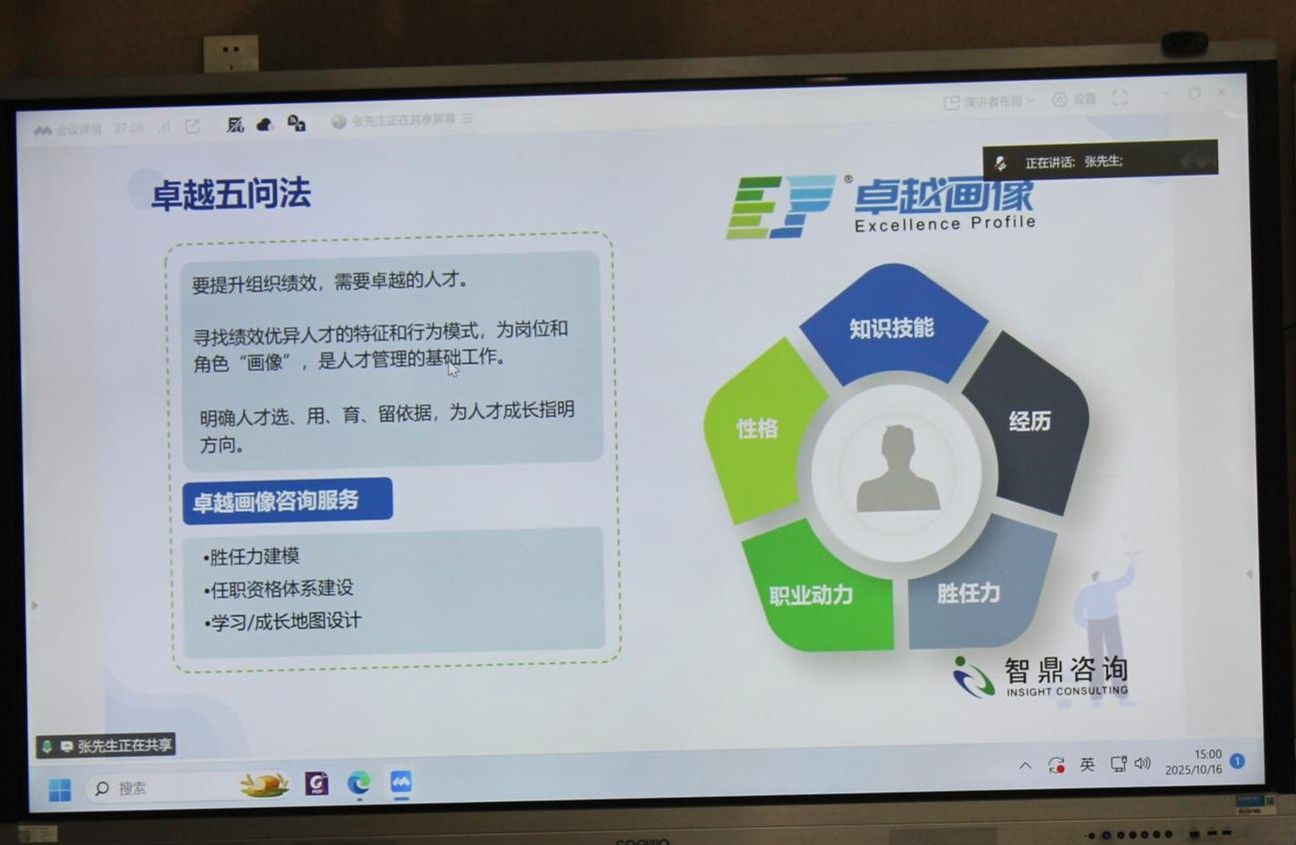 张登印先生介绍“卓越五问法”,提出要提升组织绩效,需聚焦卓越人才,通过寻找绩效优异人才的特征和行为模式,为岗位和角色“画像”,是人才管理的基础工作。他阐述了卓越画像的五要素:知识技能、经历、胜任力、职业动力、性格,明确这是人才选、用、育、留的依据,也为人才成长指明方向。